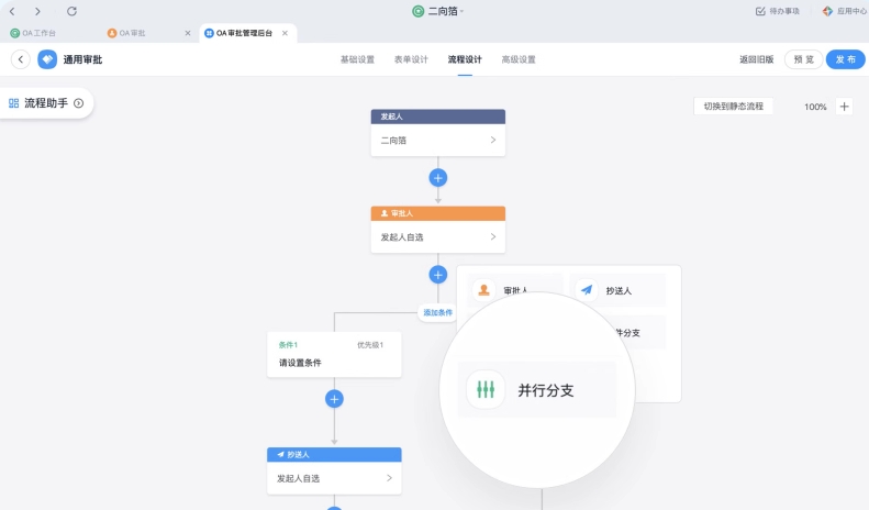 通過并行節(jié)點、業(yè)務(wù)規(guī)則、動態(tài)流程、OCR識別、單選數(shù)據(jù)聯(lián)動、多條件組合等能力支持企業(yè)90%以上的業(yè)務(wù)流程